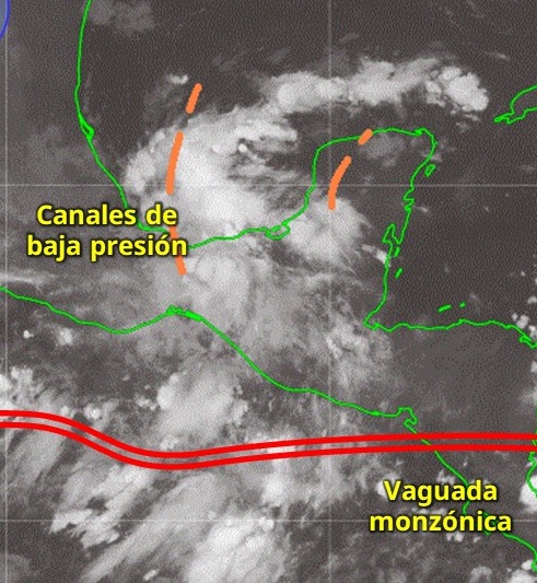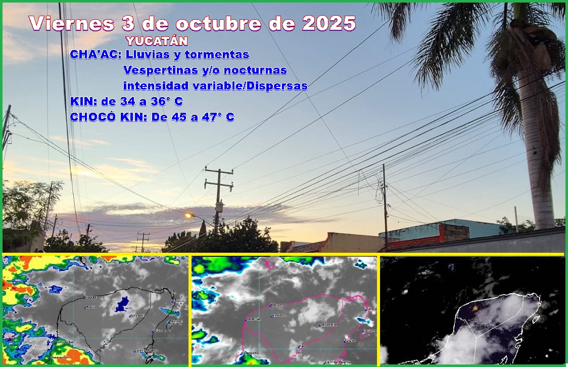 MÉRIDA, Yucatán, viernes 03/10//25.- Para hoy viernes se esperan lluvias, debido al calentamiento diurno propio de la zona, formadora de tormentas, a dos canales de baja presión, uno orientado desde el Golfo de México hasta Centroamérica, y el otro orientado frente a costa Norte de Yucatán, en el Golfo de México.