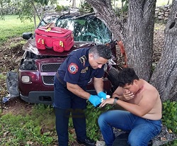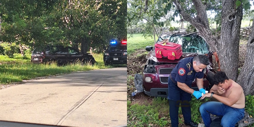 TEMAX , Yucatán, sábado 04/10/25.- El maestro Edwin Martín Estrada, de 29 años de edad y oriundo de Dzilam González quedó lesionado ayer viernes en la tarde, luego que perdió el control de una camioneta y se estrelló contra un árbol en el tramo Temax-Dzilam González.