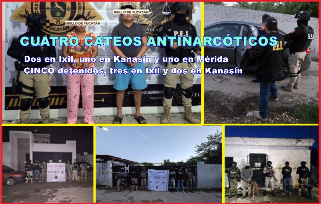 MÉRIDA, Yucatán, domingo 05/10/25.- La SSP y varias autoridades policiacas y militares detuvieron, en cuatro cateos de anteayerviernes y de hoy domingo a CINCO mininarcos y decomisaron OCHO kilos de marihuana, 220 gramos de cocaína, 123.7 gramos de “cristal”, 369 gramos de metanfetaminas y 387.9 gramos de crack.