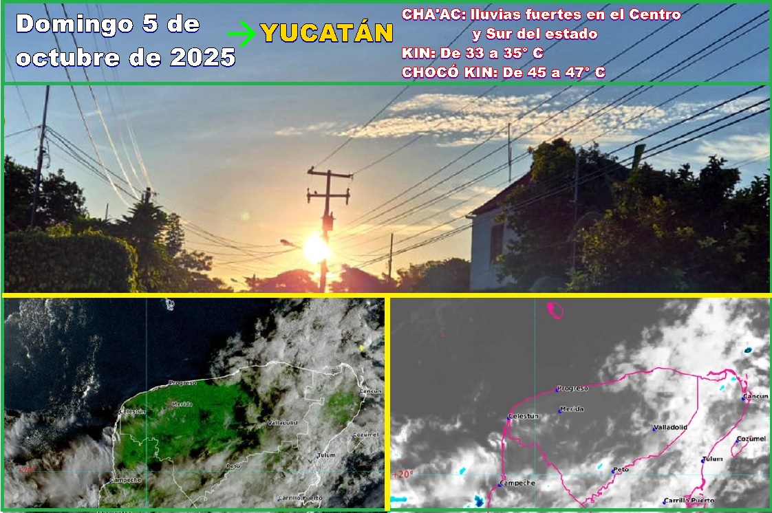 MÉRIDA, Yucatán, domingo 05/10/25.- Para hoy domingo el paso de la onda tropical 36 e inestabilidad en niveles medios y altos de la tropósfera ocasionarían lluvias fuertes en el Centro y Sur de Yucatán.