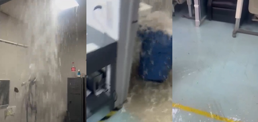 El problema trascendió gracias a un video que circula en redes sociales, donde se ve que del techo cae un enorme chorro de agua. Una bote de basura que pusieron para recolectar el agua es insuficiente para la gran cantidad de agua y rebosa inundando toda el área.
