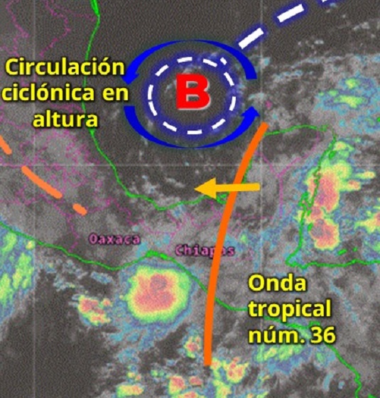 En las próximas 24 horas se espera cielo de parcialmente nublado a nublado, habría tormentas fuertes en Campeche, así como tormentas muy fuertes en Quintana Roo, debido al paso de la onda tropical número 36 y a una vaguada en altura.