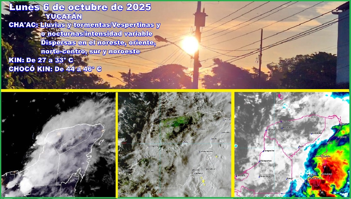 MÉRIDA, Yucatán, lunes 06/10//25.- El calentamiento diurno propio de la zona, formadora de tormentas, y un canal de baja presión, se esperan lluvias y tormentas vespertinas y/o nocturnas, en especial en el noreste, oriente, norte-centro, sur y noroeste yucatecos.