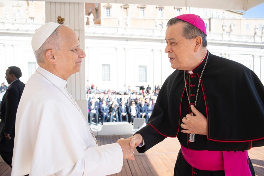 CIUDAD DEL VATICANO, miércoles 08/10/2025.- En un gesto de respeto y comunión eclesial, el Arzobispo de Yucatán, monseñor Gustavo Rodríguez Vega, saludó al Papa León XIV al término de la Audiencia Jubilar, celebrada en el marco del Jubileo de los Migrantes y las Misiones.