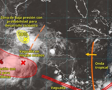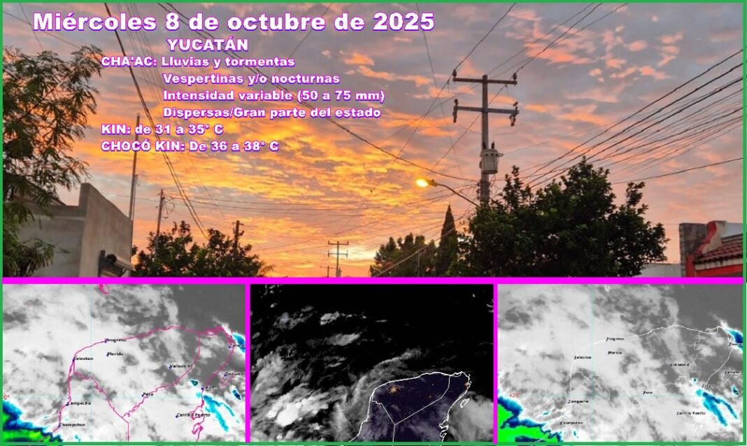 MÉRIDA, Yucatán, miércoles 08/10//25.- Una amplia zona de baja presión, ubicada cerca de la costa del centro de Campeche y de amplio manto nuboso, y un canal de baja presión, ocasionarían hoy miércoles lluvias y tormentas eléctricas en gran parte del estado.