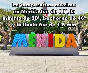 MÉRIDA: Máxima, 36° C, Poniente; mínima 20°, en el Norte; bochorno, 46º; lluvia, 1.6 mm, en el Sur