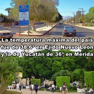 MÁXIMAS: Yucatán, 36º C, Mérida Poniente; México, 38.6º C, Ejido Nuevo León, Baja California