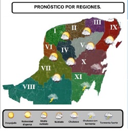 Aire marítimo tropical y una vaguada, ubicada al Oriente de la Península de Yucatán, ocasionarían cielo de despejado a parcialmente nublado con probabilidad de chubascos en el sur de Campeche y en el centro y sur de Quintana Roo. El ambiente será caluroso en la tarde y el viento soplará del noroeste, de 15 a 20 km/h y rachas mayores a 35 km/h en zonas costeras.
