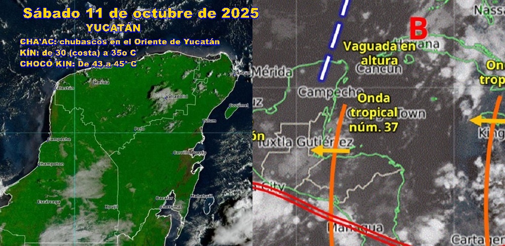 MÉRIDA, Yucatán, sábado 11/10/25.- Para hoy sábado, aire marítimo tropical y una vaguada, ubicada al Oriente de la Península de Yucatán ocasionarían chubascos en el Oriente del estado, en tanto que la temperatura máxima sería de 33 a 35º C y el bochorno de 45º C.