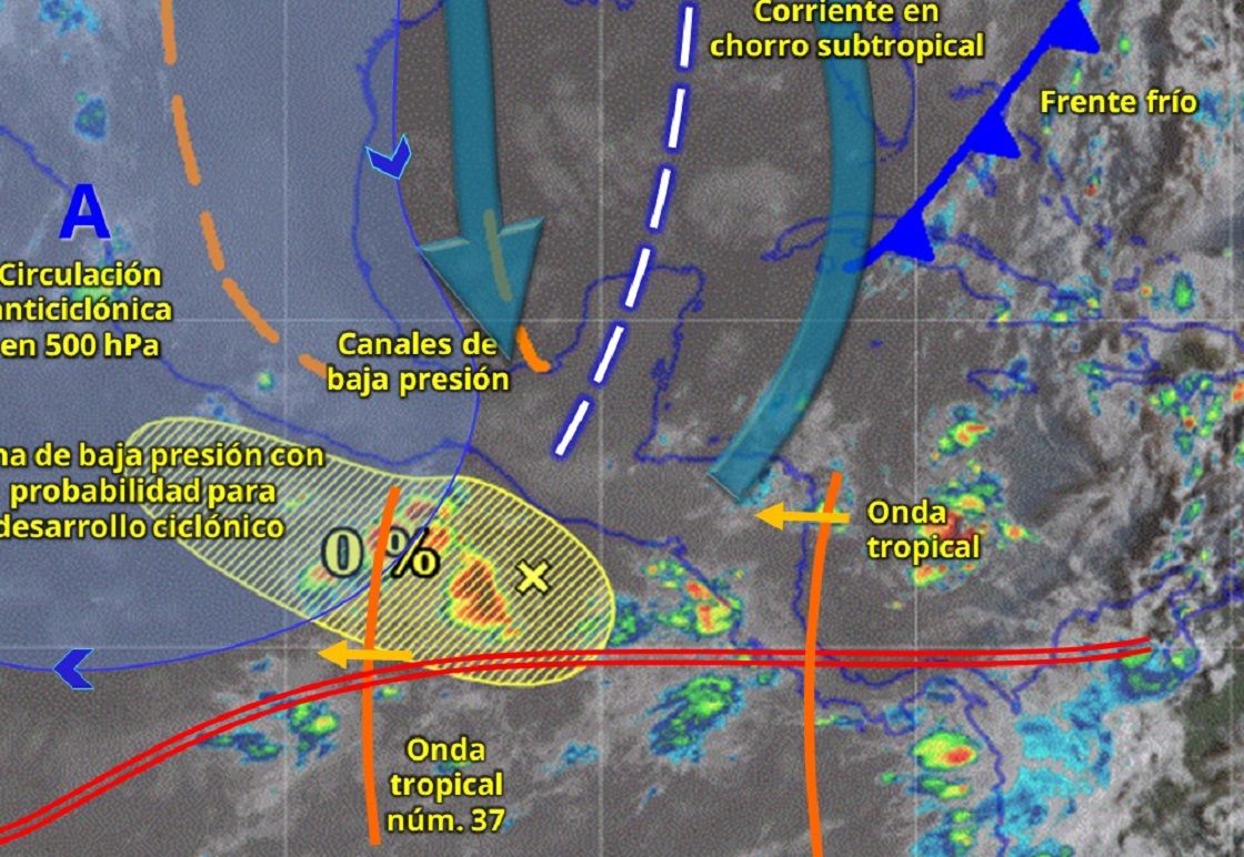 En CAMPECHE y QUINTANA ROO se espera cielo despejado a medio nublado, probabilidad de lloviznas y chubascos vespertinos, debido a aire marítimo tropical, al calentamiento diurno y a una vaguada térmica. Se pronostica ambiente caluroso en la tarde, con viento de dirección noroeste, de 15 a 20 km/h y rachas mayores a 35 km/h en zonas costeras.