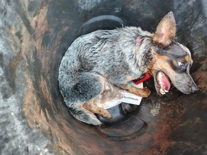 MÉRIDA, Yucatán, domingo 12/10/2025.- Una perrita de raza pastor australiano fue encontrada con lesiones dentro de un bote de basura en la colonia Plan de Ayala Norte, lo que activó la intervención de las autoridades por un posible maltrato animal.