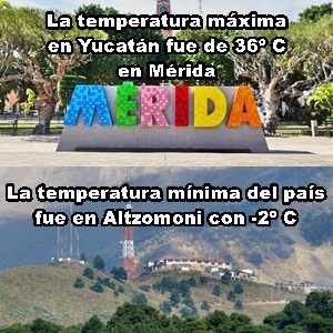 MÍNIMAS: Yucatán, 18º C, Mérida Norte; México, -2º C, Altzomoni, Estado de México