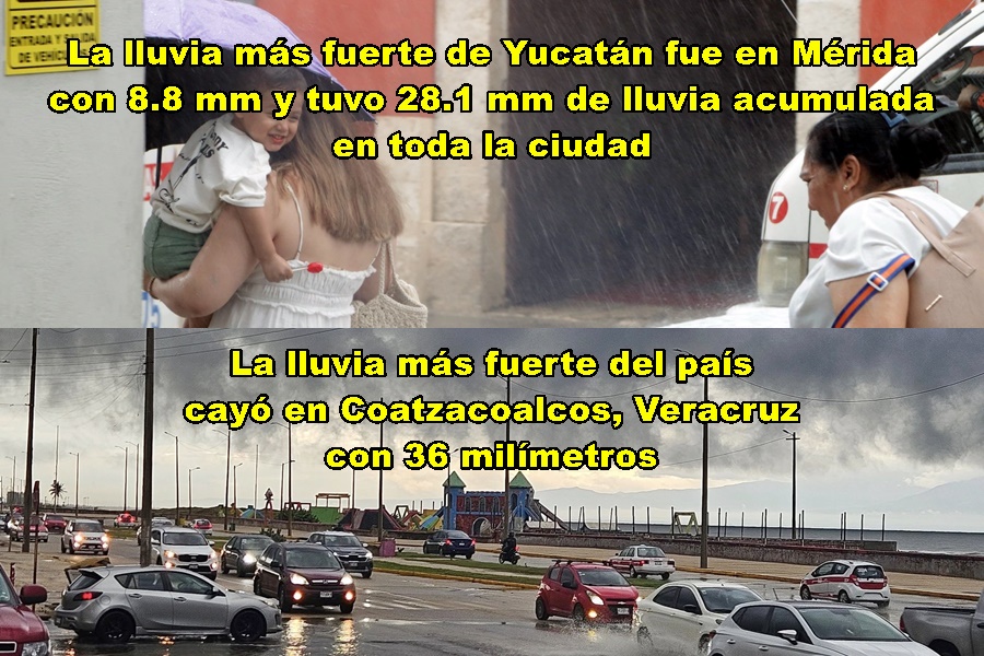 En cuanto a la lluvia, la más fuerte del país cayó en Coatzacoalcos y fue de 36 milímetros, en tanto que en Mérida hubo un acumulado de 28.1 mm y las más fuerte fue en Norte con 8.8 mm.