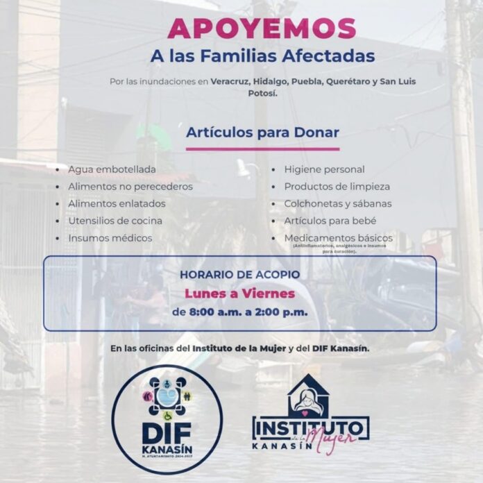 KANASÍN, Yucatán, miércoles 15/10/2025.- El DIF de Kanasín y el Instituto Municipal de la Mujer de Kanasín han instalado dos centros de acopio en el municipio para donación de víveres y productos en apoyo de las familias de Veracruz, Hidalgo, Puebla, Querétaro y San Luis Potosí que en los últimos días han sufrido severos daños y afectaciones por las fuertes inundaciones que se presentaron hace algunos días en esa zona del país.