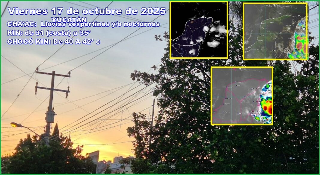 MÉRIDA, Yucatán, viernes 17/10//25.- Un canal de bajas presiones y el calentamiento diurno, propio de la zona formadora de nubes de tormenta, ocasionarían en Yucatán lluvias en la tarde y/o en la noche, con calor de 31º en la costa a 35º C en la mayor parte del estado, bochorno de 42° C.