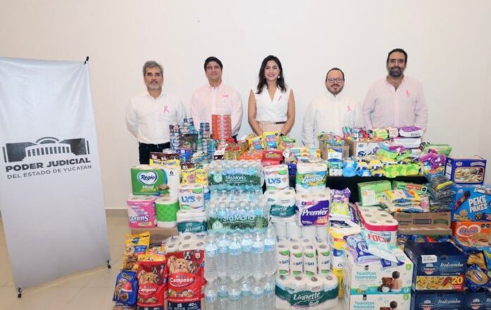 MÉRIDA, Yucatán, lunes 20/10/2025.- Trabajadores del Poder Judicial del Estado se solidarizaron con las familias de los estados de Veracruz, Querétaro, Hidalgo y San Luis Potosí afectadas por las inundaciones, a causa de las intensas lluvias, mediante la donación de alimentos, artículos de higiene personal y de limpieza.
