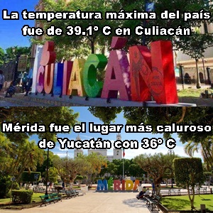 MÁXIMAS: Yucatán, 36º C, Mérida Norte; México, 39.1º C, Culiacán, Sinaloa