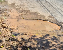 A la mitad de la calle hay un enorme bache, que la Comuna no tapó hace algunos días, pues es una gran fuga de agua potable: Hoy, luego de casi una semana sin lluvias ese hoyanco sigue lleno de agua, mientras Panchairo abre la boca para decir pendejadas y tomar alcohol, que es lo mejor que sabe hacer.