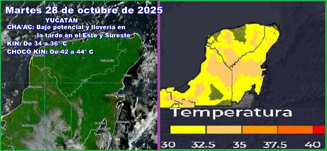 El cielo será de medio nublado a mayormente despejado y la temperatura máxima será de 30º (en la costa) a 36º C, en el Sur yucateco, con una sensación térmica de 44° C, indican Georgina Carrillo Martínez y Manuel Morales Quiñones, con revisión de Juan Vázquez Montalvo, del CHMDY CIAFEME.