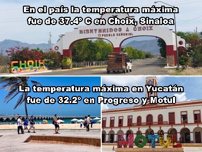 MÁXIMAS: Yucatán, 32.2º C, Progreso y Motul; México, 37.4º C, Choix, Sinaloa