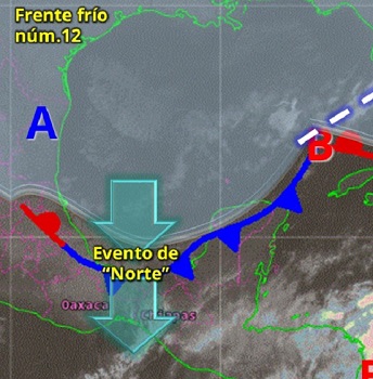 MÉRIDA, Yucatán, lunes 03/11//25.- En el segundo “norte” que afecta a Yucatán en sólo CINCO días, hoy llegará el frente frío 12, que será débil, y se quedará estacionado en el Norte de la Península de Yucatán y en el Occidente del Mar Caribe.
