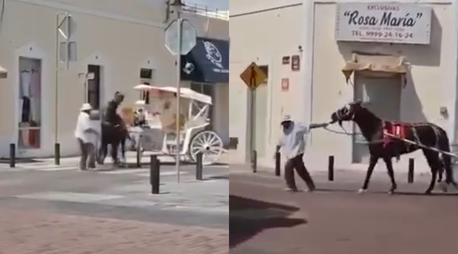 MÉRIDA, Yucatán, lunes 03/11/2025.- Un conductor de calesa golpeó a un caballo en el Centro de Mérida, a un costado del parque de Santa Ana.