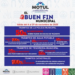 MOTUL, Yucatán, martes 04/11/25.- El Ayuntamiento que encabeza el alcalde Lucio Estrella Canul se une al programa nacional del Buen Fin y ofrece descuentos significativos que permitirán a los ciudadanos y comerciantes ponerse al día en sus trámites y contribuciones municipales.