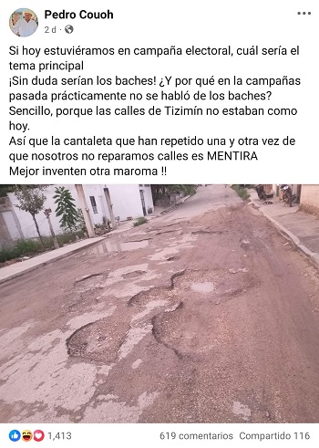 EN CONTEXTO: En su cuenta de Facebook, Pedro Couoh quien es el papá político del alcalde Lata de Gas, comparó los resultados de su administración con los del actual, y demostró que, pese a contar con mayor presupuesto, el gobierno de Morena ha tenido un menor avance en infraestructura.