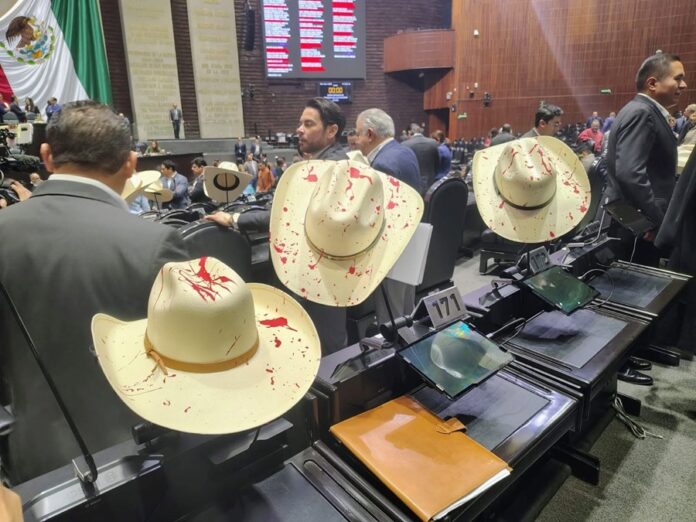 Los sombreros ensangrentados, ya símbolo del Movimiento del Sombrero, nacido tras el asesinato de Manzo, se alzaron dentro del pleno como emblema de resistencia. Las veladoras encendidas en los escritorios dibujaron un escenario inusual: el del Congreso convertido en altar.