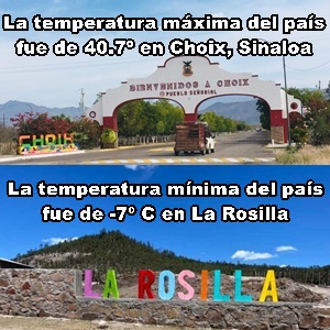 En lo que toca a la temperatura más alta del país, fue de 40.7º C, en Choix, y la temperatura mínima fue de -7º C, en La Rosilla, que es la más baja de la temporada invernal 2025-2026. La más baja del año es de -23º C, que se registró en Villa Ahumada, Chihuahua, el sábado 11 de enero.