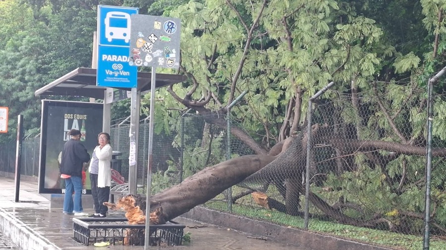 MÉRIDA, Yucatán, lunes 10/11/2025.- Una persona estuvo a punto de ser aplastada por la caída de un árbol cuando esperaba el autobús, en un paradero junto al Zoológico del Centenario, sobre la calle 59 entre avenida Itzaes y la 84.