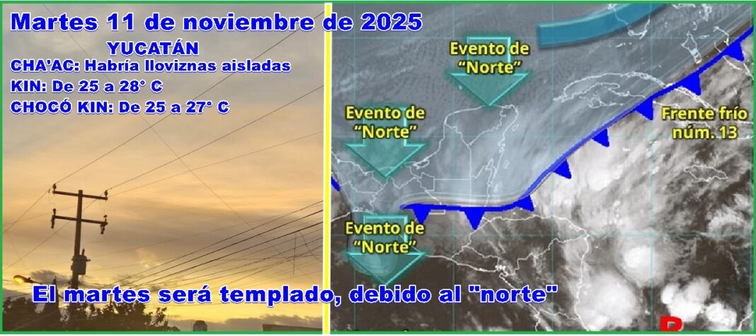 MÉRIDA, Yucatán, martes 11/11/25.- Debido a los efectos de la masa de aire polar ártico (frío) hubo frío en la madrugada y al amanecer y en el día habría lloviznas aisladas en todo el estado, con ambiente templado.