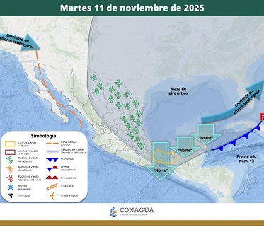 Se espera cielo de medio nublado a nublado durante el día, con chubascos en Campeche y lluvias aisladas en Quintana Roo. El ambiente será de fresco a templado durante el día y seguirá el “Norte” de 30 a 40 km/h, con rachas de 50 a 70 km/h en costas de Campeche y Quintana Roo. Oleaje de 2 a 3 metros de altura en ambos estados.