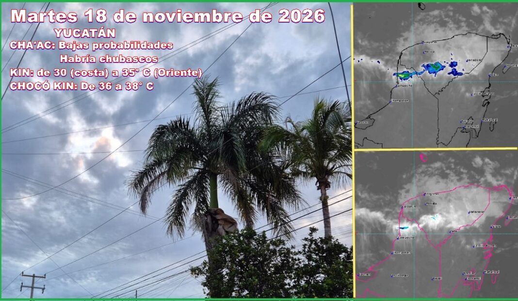 MÉRIDA, Yucatán, martes 18/11/25.- Para hoy martes, en Yucatán se espera ambiente caluroso, con temperaturas máximas de 33 a 35º C, en Izamal, Tekax y Ticul, bochorno de 38º y habría chubascos.