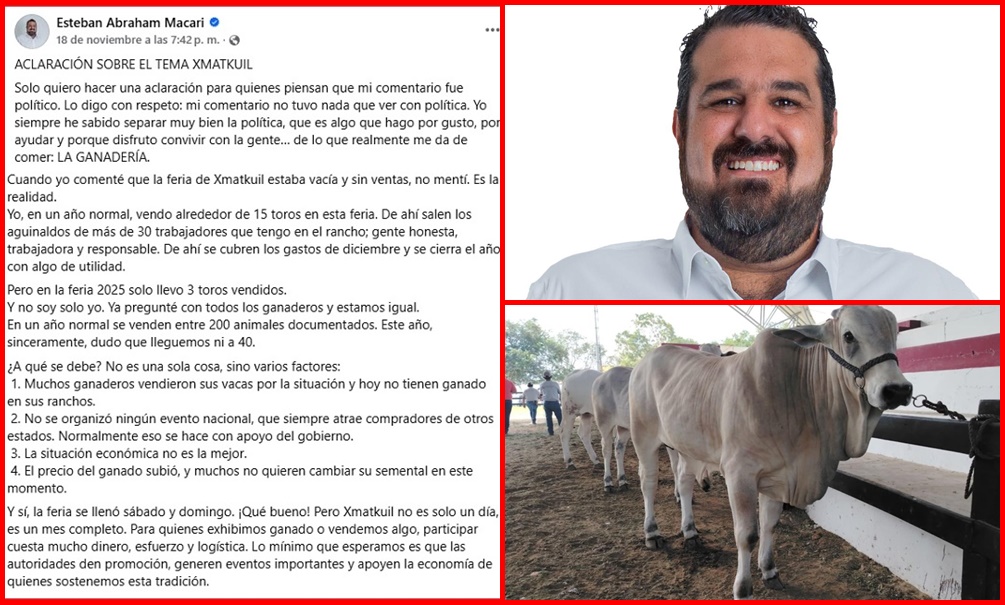 Por medio de su cuenta de Facebook, el “Simio Macari”, ex diputado local, quien es ganadero de muchos años, denunció la falta de ventas y la baja participación en eventos ganaderos, lo que dijo era impensable en ediciones anteriores.