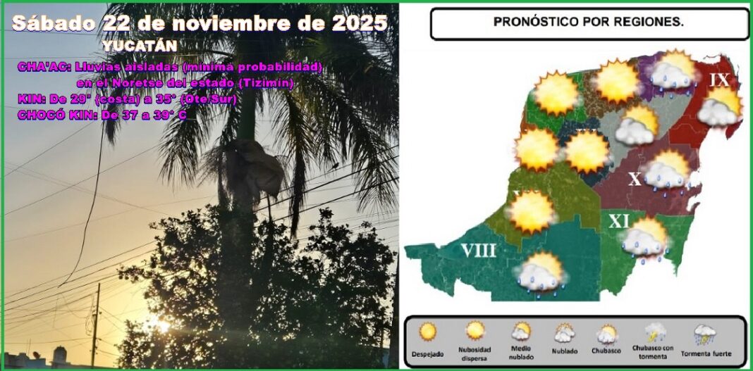 MÉRIDA, Yucatán, sábado 22/11/25.– Hoy sabadito, tercero de la Feria de Xmatkuil, se espera buen tiempo con Sol en el día y sin lluvias en Mérida. Se pronostican temperaturas máximas de 33 a 35º C en gran parte del estado.