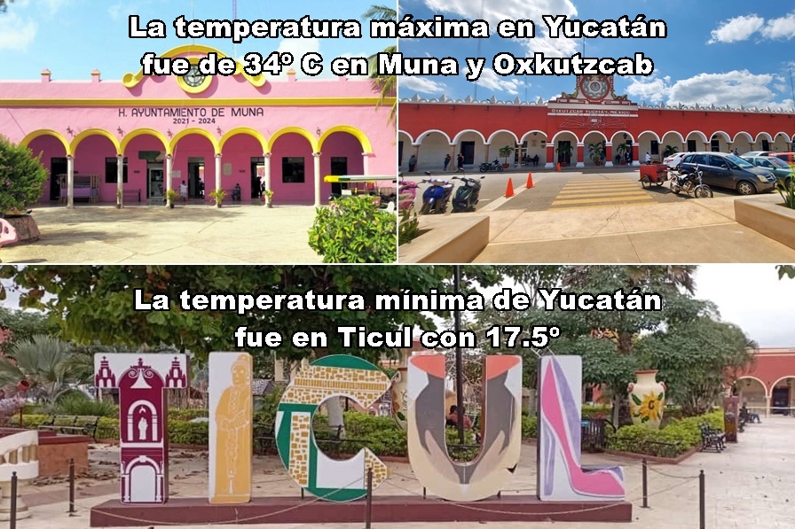MÉRIDA, Yucatán, sábado 22/11/25.- Con 34º C, ayer viernes Oxkutzcab fue el lugar con la temperatura máxima en Yucatán, y se quedó a 1.3º del primer lugar nacional, que fue de 35.3º, en Monterrey y en Arriaga.