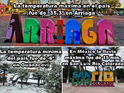 Respecto a las temperaturas mínimas, la más baja del país fue de -6º C en Guanaceví, y en Yucatán fue de 17.5º, en Ticul. En el estado no llovió ayer, en tanto que en México la lluvia más fuerte fue de 15 milímetros, en San Luis Río Colorado.