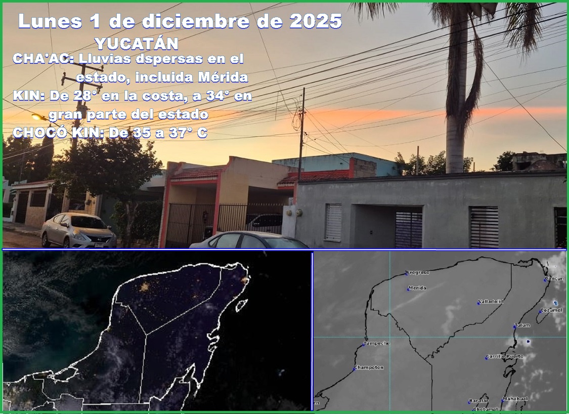 MÉRIDA, Yucatán, lunes 01/12/25.- En el primer día del último mes del año, en Yucatán se pronostican temperaturas máximas de 28º, en la Costa, a 34º C en gran parte del estado, con probabilidad de lluvias dispersas y sensación térmica de 35 a 37º C.
