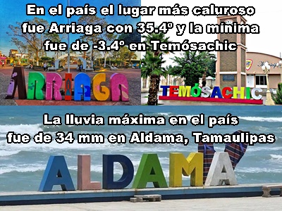 MÍNIMAS: Yucatán, 15.5º C, Muna y Mérida Norte; México, -3.4º, Temósachic, Chihuahua