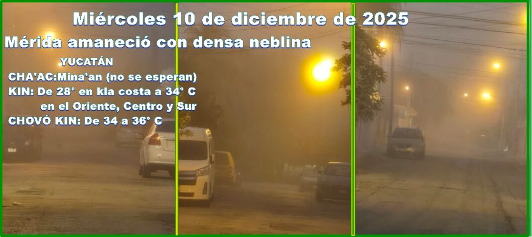 MÉRIDA, Yucatán, miércoles 10/12/25.– Buena parte de Yucatán amaneció con densa neblina, como en esta ciudad meridana, hoy miércoles cuando se espera una temperatura máxima de 32 a 34º C en el Oriente Sur y Centro del estado.