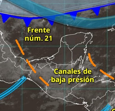 Se pronostica cielo de despejado a parcialmente nublado, con probabilidad de chubascos y lluvias aisladas en ambos estados, debido a la entrada de aire húmedo del Golfo de México y del Mar Caribe y a la cercanía del frente frío 21. La masa de aire polar que lo impulsa ocasionará un “Norte”, con posibles rachas mayores a 50 km/h en la costa de Campeche y Quintana Roo, así como un leve descenso de temperatura hoy lunes en la noche y en la madrugada del martes.