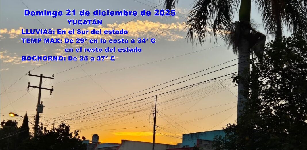 MÉRIDA, Yucatán, DOMINGO 21/12/25.– Hoy, en el penúltimo domingo del año, luego de la sorpresiva lluvia de ayer en la tarde y en la noche, en Yucatán se espera una temperatura máxima de 32 a 34º C, bochorno de 34 a 37º C.