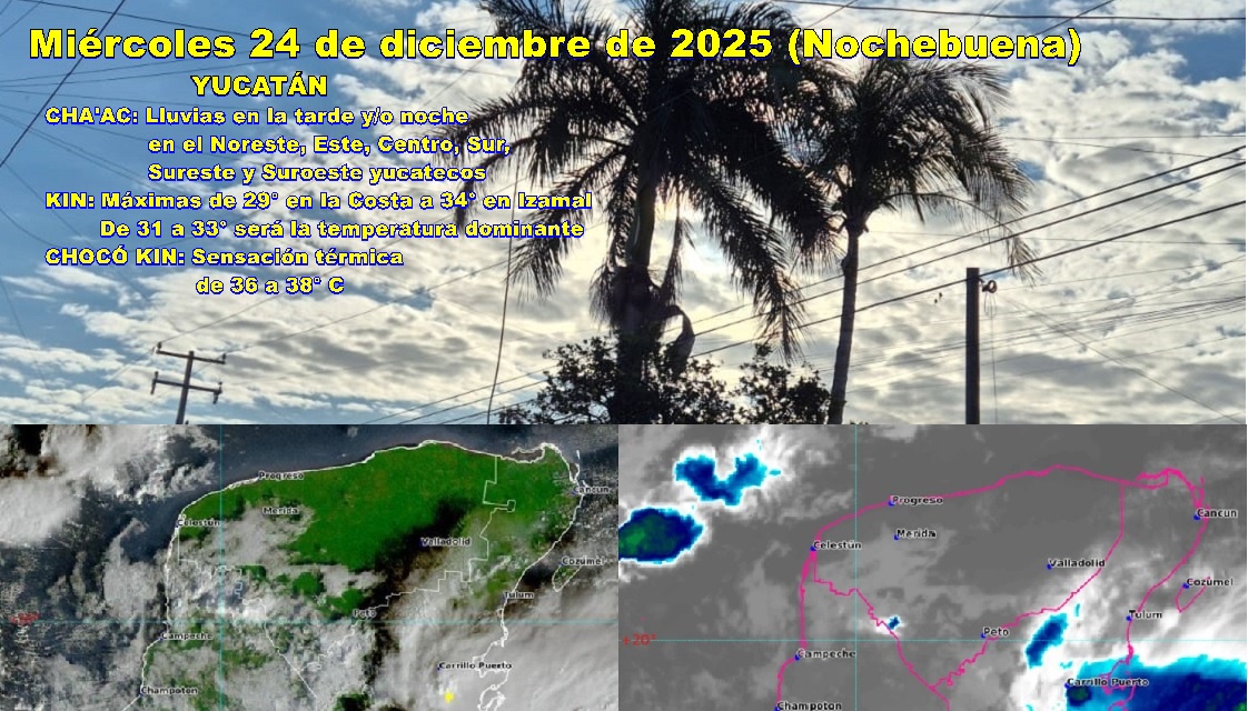 MÉRIDA, Yucatán, miércoles 24/12/25.– Luego de una amanecer de fresco a frío, con bancos de niebla y neblina, se pronostica ambiente caluroso, con temperaturas máximas de 29º en la costa y en el Sur, a 34º C en Izamal, con sensación térmica de 38º.
