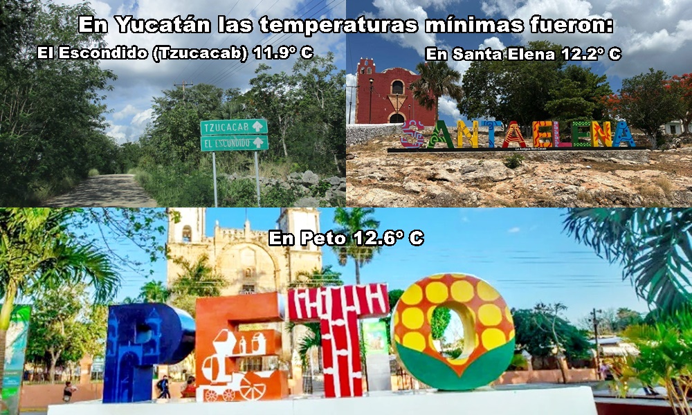 CENTRO: Kantunil, 14.9º C; Suroeste, Maxcanú, 14º; Oeste, Kinchil, 14.9º; Noreste, Tizimin, 14º, y Colonia Yucatán (Tizimín), 13.5º; Cinturón de Cenotes, Timucuy, 14.7º, y Xcanchakán, 14.4º; Zona Exhenequenera, Izamal, 15.1º y Bokobá, 14.7º C; Este, Xalau (Chemax), 14,1º y Valladolid, 14.3º; Sureste, Peto, 12.6º y Chan Chichimilá (Chacsinkín), 12.8º; Sur Puc, Santa Elena, 12.2º, y Cono Sur, El Escondido (Tzucacab) 11.9º C.