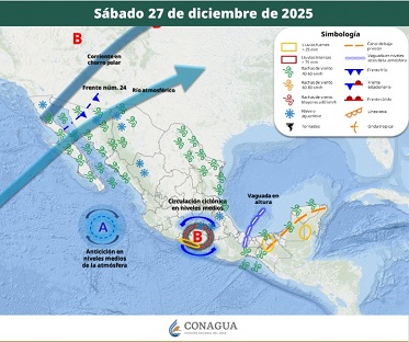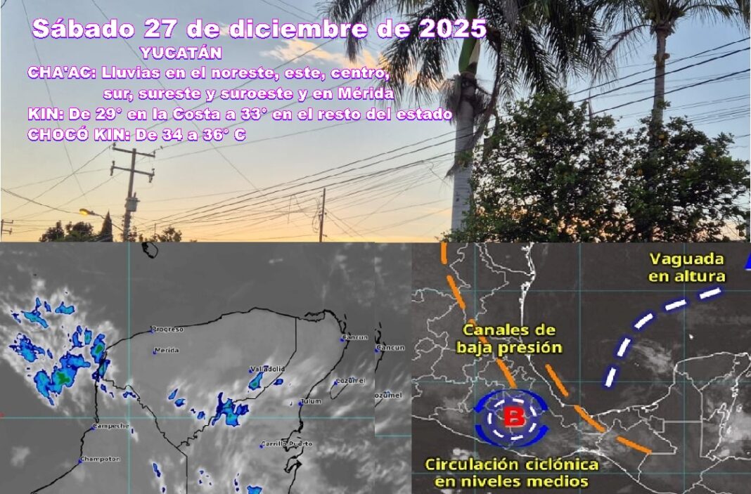 MÉRIDA, Yucatán, sábado 27/12/25.– Hoy, en el último sábado del año, en Yucatán se espera una temperatura máxima de 31 a 33º C, bochorno de 34 a 36º C y habría lluvias vespertinas y/o nocturnas.