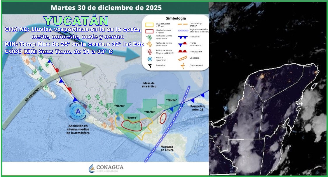 MÉRIDA, Yucatán, martes 30/12/25.- Hoy, en el penúltimo día del año, el “Norte de Año Nuevo”, sétimo que afecta al estado en la temporada 2025-2026, arribará al mediodía y causará vientos de 88 Km/h en la costa y bajará las temperaturas de la tarde y de la noche.