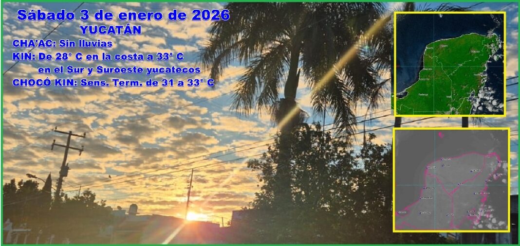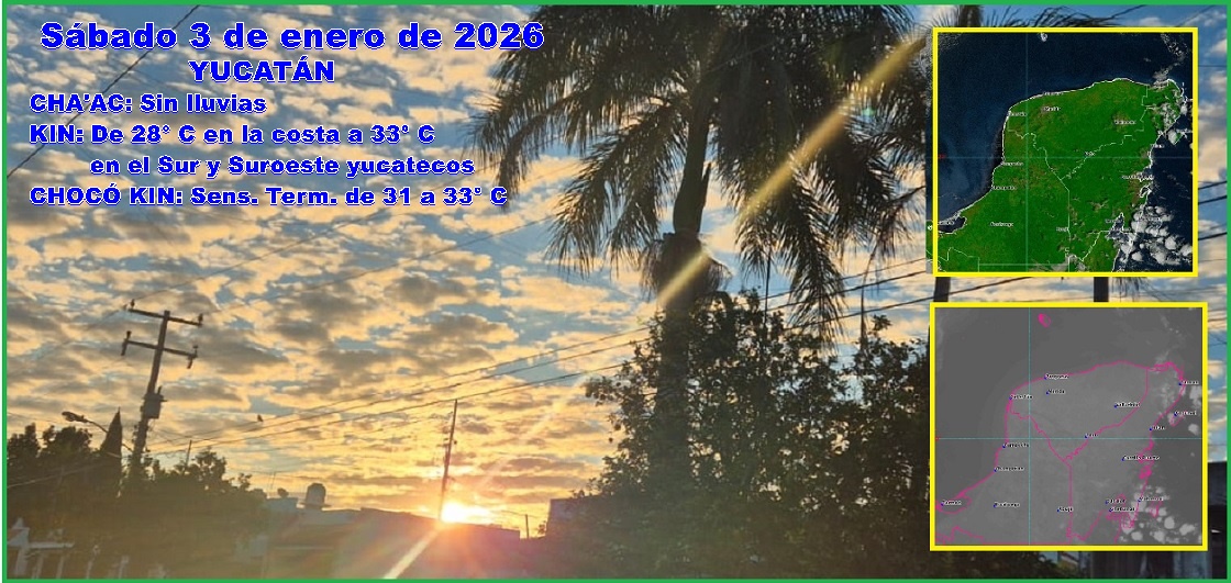 MÉRIDA, Yucatán, sábado 03/01/26.- En el primer sábado del año, cha’ac sigue desaparecido de Yucatán y se espera cielo parcialmente nublado sin lluvias en el estado y con temperaturas máximas de 28º en la costa a 33º C en el Sur y Suroeste yucatecos.