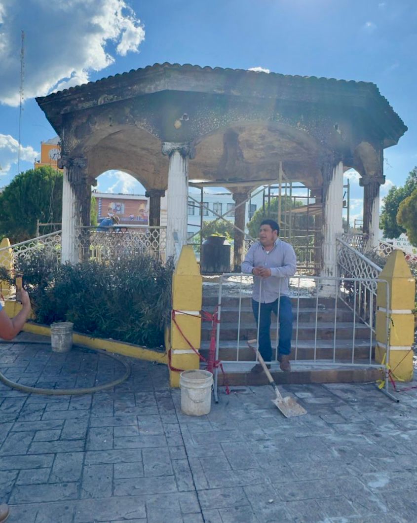 KANASÍN, Yucatán, lunes 05/01/2026.- El alcalde Edwin Bojórquez Ramírez anunció este mediodía el inicio de los trabajos de rehabilitación del quiosco del parque principal, luego de que se quemara en días pasados por un petardo que cayó en el nacimiento de paja instalado en el sitio.
