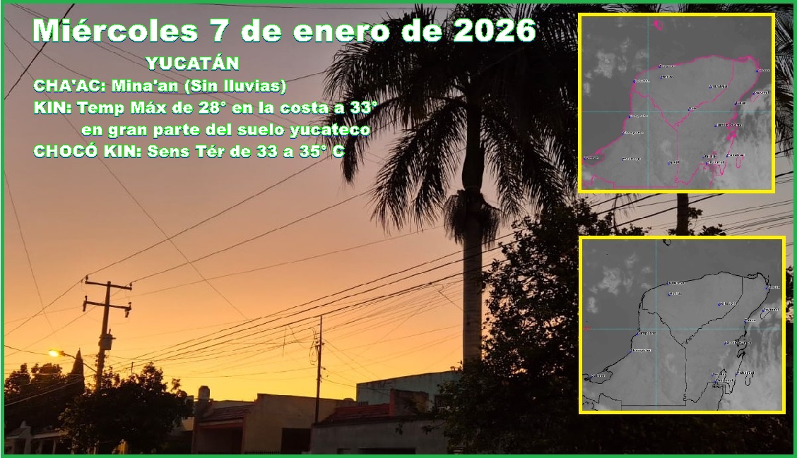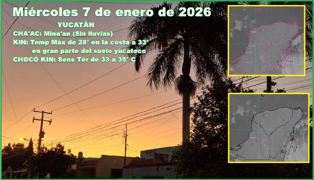 MÉRIDA, Yucatán, miércoles 07/01/26.- Hoy miércoles, en Yucatán no habrá lluvias, pues cha’ac sigue “ido” del estado, en tanto que las temperaturas máximas serán de 28º en la costa a 31º C en buena parte de la tierra de Armando Manzanero.